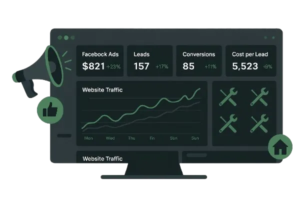 You get a live dashboard that shows calls, forms, cost per lead, conversion to booked jobs, and revenue by service line, plus a monthly summary that explains what we changed and what results it produced.